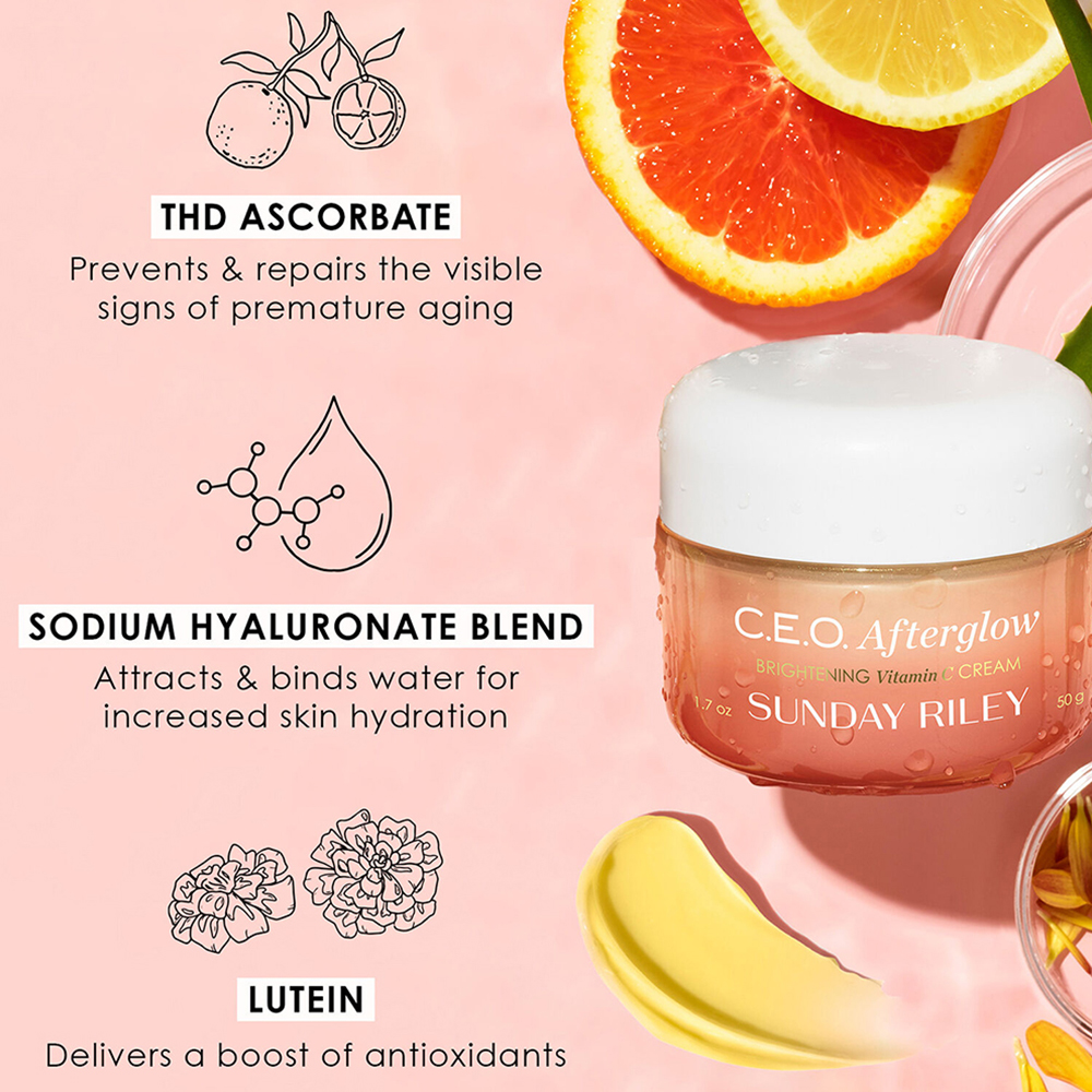 Boost radiance with the Sunday Riley C.E.O. Afterglow Brightening Vitamin C Cream, a revitalising moisturiser packed with nutrients to help hydrate and brighten the complexion.